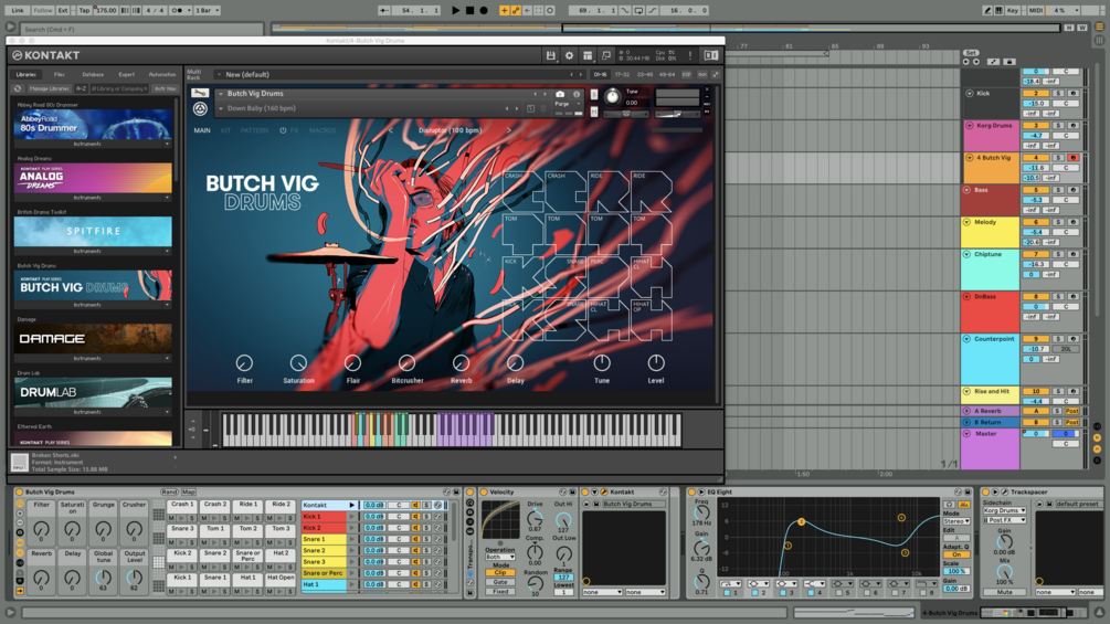 This drum rack for Ableton Live lets you use Native Instruments Butch Vig Drums just like any other drum rack in Live and Push, including the eight macro knob encoders. Just drag and drop this file in an empty MIDI track and you're set.
